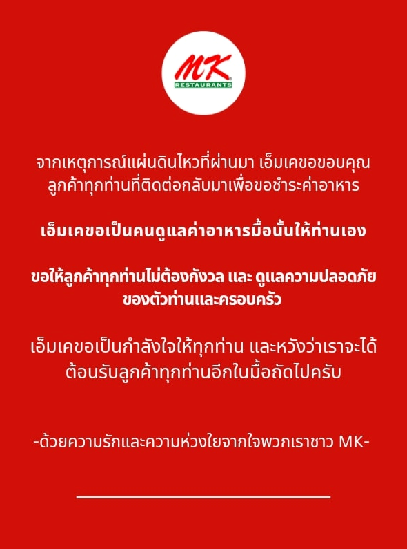หลังเหตุการณ์แผ่นดินไหว MK ร้านอาหารชื่อดัง ออกมาประกาศว่า “ลูกค้าทุกท่านที่ต้องทิ้งอาหารระหว่างหนีแผ่นดินไหว ไม่ต้องชำระเงิน” โดยให้เหตุผลว่านี่เป็นอุบัติภัย พวกเขาเข้าใจสถานการณ์และต้องการแสดงน้ำใจแทนที่จะกล่าวโทษลูกค้า