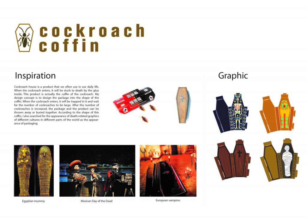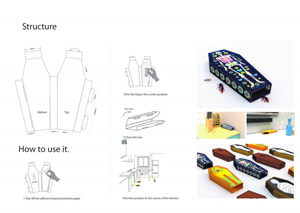 The competition saw a wide range of design entries including creative takes on lanterns, die kits, bite sized art and even trash can bags. The real appeal of Hailei’s design comes from its blend of practical and playful. Cockroaches are a pest around the world and cockroach traps are a common feature in millions of households. So, Hailei thought, why not a bit of fun with such mundane but necessary object? “This product is actually the coffin of the cockroach,” he explains. He researched burial practices around the world and came up with a variety of playful designs. What makes them so successful is that they reflect what they are – coffins – but instead of being too morbid, are actually fun.