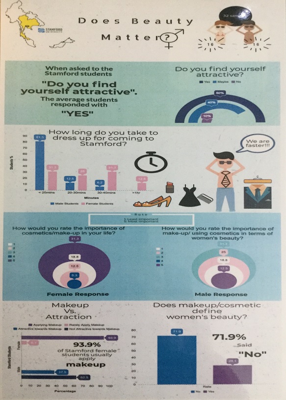 All sections from the Rama 9 and Hua Hin campuses participated in the competition. Students formed groups and were required to use statistical methods to collect, organize, analyze, and report results in a poster presentation. The winning teams were awarded Central gift cards and certificates. All posters will be on display in Building 2, Rama 9 campus.